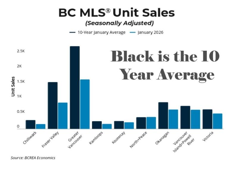 The Central Okanagan real estate market remains essentially flat in January 2026 after correcting through 2023 and stabilizing mid-2024. The absorption rate is 9.68% (percentage of properties sold in a given period), technically this means a buyer’s market (below 12%), but other indicators suggest more balanced conditions. January recorded 91 sales, compared to 110 in 2025 and 79 in 2024. Inventory has been declining since May 2025, signalling improving supply-demand balance. Average prices remain steady at approximately $1.06M-$1.07M over the past three months. With inflation near 2% and interest rates stabilizing, the outlook for 2026 is continued stability with a slight recovery, though global uncertainty may temper confidence.Also, people are starting to cautiously step off the fence, not jump though, and most REALTORS® , including myself, are reporting an increase in activity in February. Although many factors are diminishing consumer/buyer confidence, people are still being transferred, having babies, getting new jobs etc. Pent-up demand means these needs are sometimes postponed but not eliminated. A general rule is that the longer and further away a market swings from the 10-year averages, the more pressure it experiences to return to that average. We have been away from the 10 year average for a while. (See Graph Below).